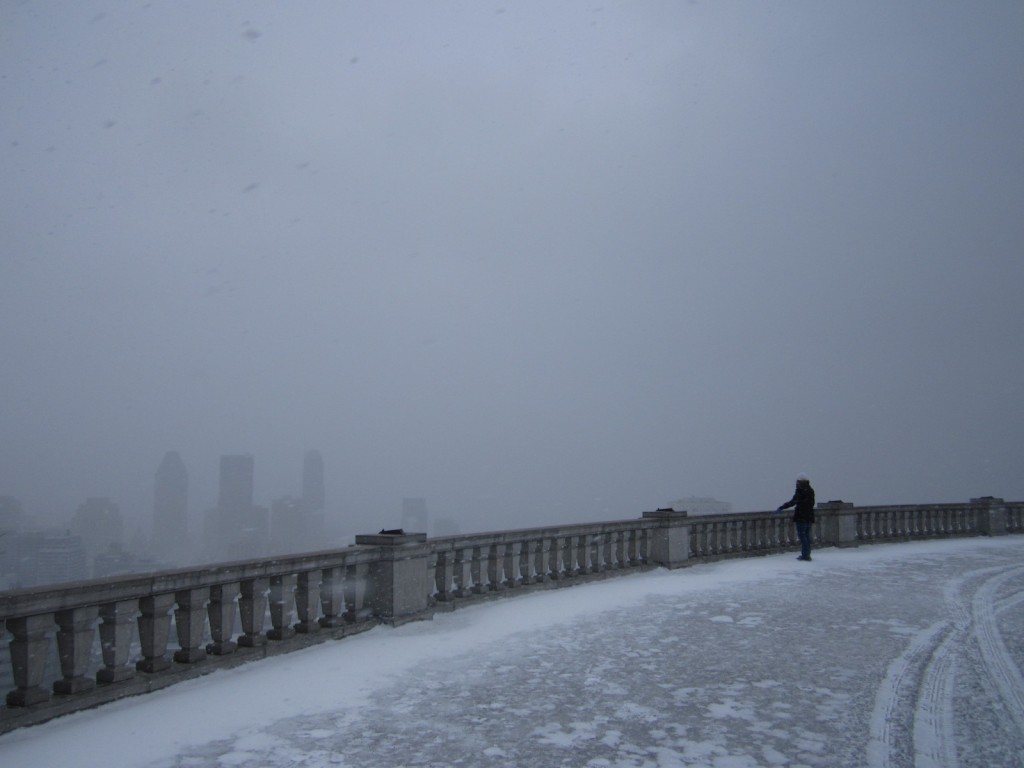 A sky of solid white stood like a harsh reality before me. Somewhere in the distance, barely discernible, the skyscrapers of Montreal braved the cold – like soldiers standing guard in an arctic post. The sweeping balustrade – which would have been thronged with happy tourists in T-shirts during the summer – was all but empty, only visited by one lone figure – a barren reminder of this now desolate park.