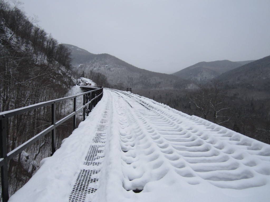 This is our favorite snow shoe route in the Whites. Although the trail is quite steep, it is only 3.2 miles round-trip. Follow the Lonesome Lake Trail as it climbs from the LaFayette Campground up through Franconia Notch. Don’t forget to turn around often as you climb this switchback-filled trail to check out the gorgeous views of the Franconia Ridge — Mts. LaFayette, Lincoln, and Haystack. When you reach the eastern shore of the lake (the first time you’ll encounter the lake), take a left to continue along the Cascade Brook Trail. This will walk you along the eastern shore.During the height of winter, whlie the lake is still well-frozen, many hikers simply cross the lake. At the next junction, continue along the Fishin’ Jimmy Trail. Head up the steep, but short hill to the Appalachian Mountain Club’s (AMC) Lonesome Lake Hut. Relax, warm up, have some lunch, and enjoy the view before heading back down. You can also stay overnight at the Hut, but reservations must be made several weeks in advance, and you’ll want to bring warm clothing and sleeping bags.