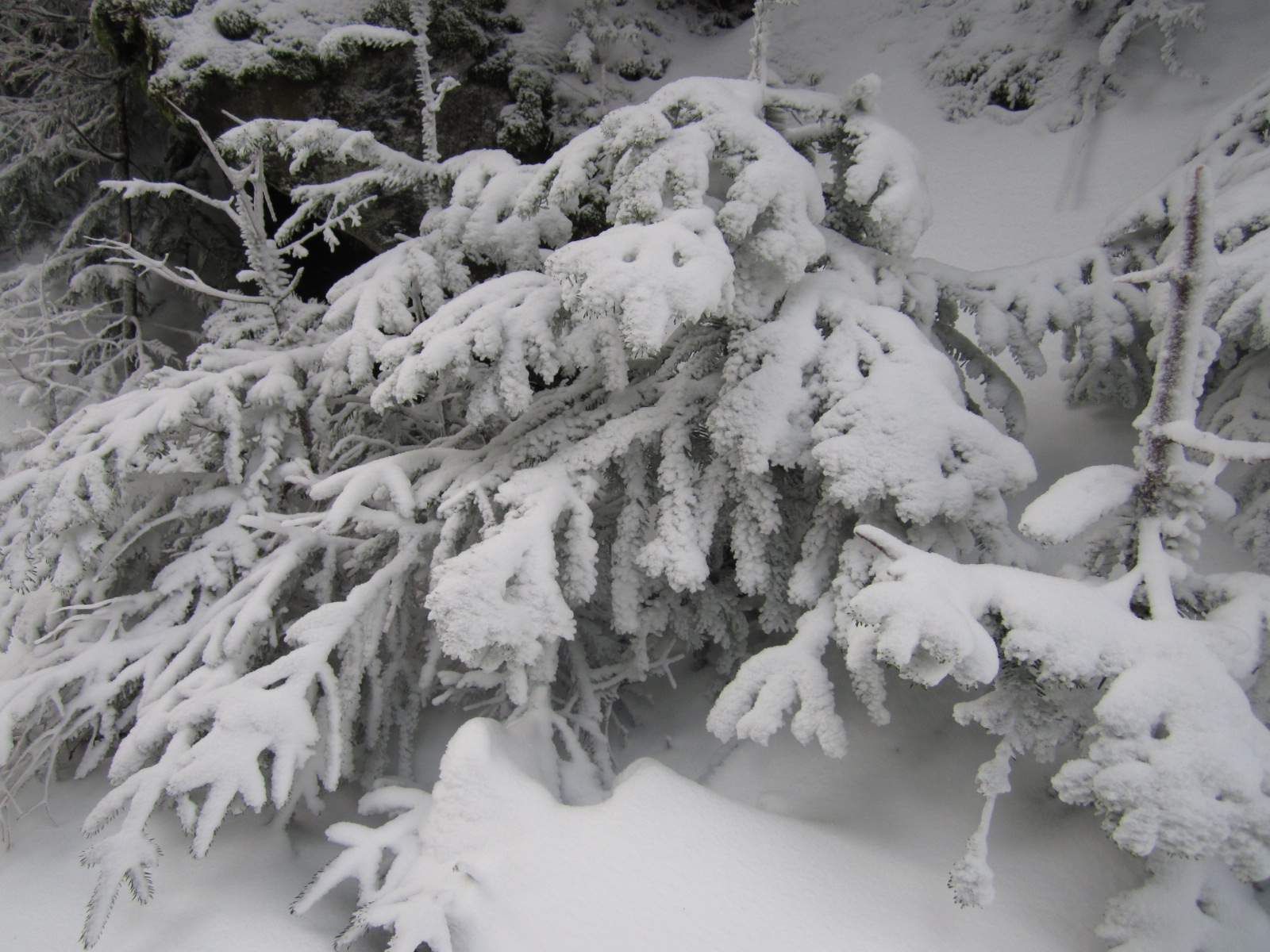 A layer of snow and ice is caked onto the vegetation on Mt. Washington, home to the world's worst weather